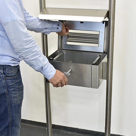 Le bac collecteur des mégots est facile à retirer, permettant un vidage rapide et propre du cendrier sur pied extérieur. Les agents techniques gagnent en efficacité lors des tournées de collecte.